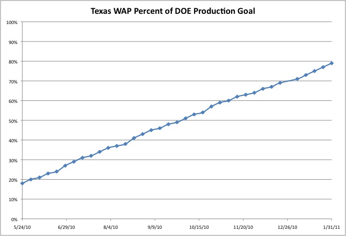 While the Jan 21st Observer article is not available online, a selection of the monitoring reports reviewed by the Observer is available at Forrest Wilder’s blog here. TDHCA’s WAP webpage, which includes the latest production numbers is available here. As of 1/31/11, production stood at 26,743 units, or 79% of TDHCA’s goal. Below is a chart of the TDHCA’s progress since last May towards the DOE Production goal.